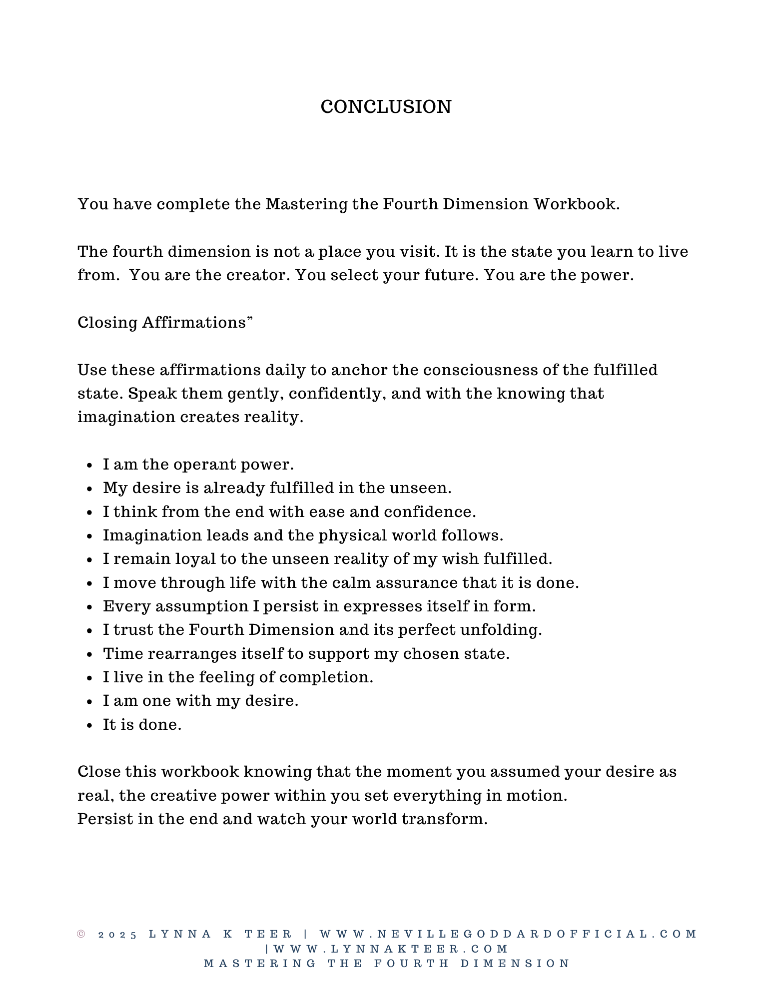 This beautifully designed workbook helps you understand and embody the Fourth Dimension, the imaginal world where your desires already exist and where true creation begins. Through structured exercises, journal prompts, reflection pages, and Fourth-Dimensional practices, you will learn to think from the end, assume your fulfilled desire, and live confidently in your chosen state.